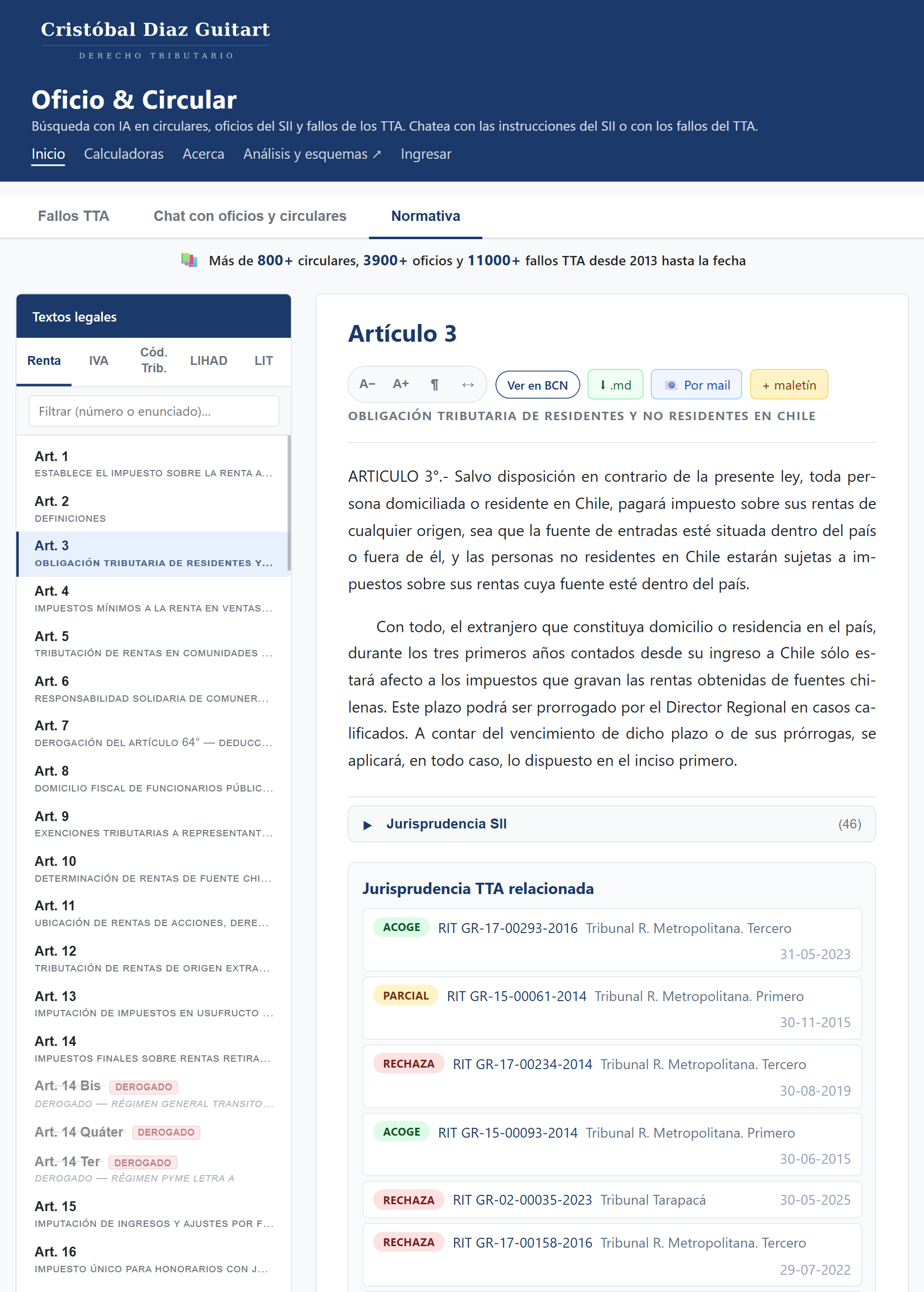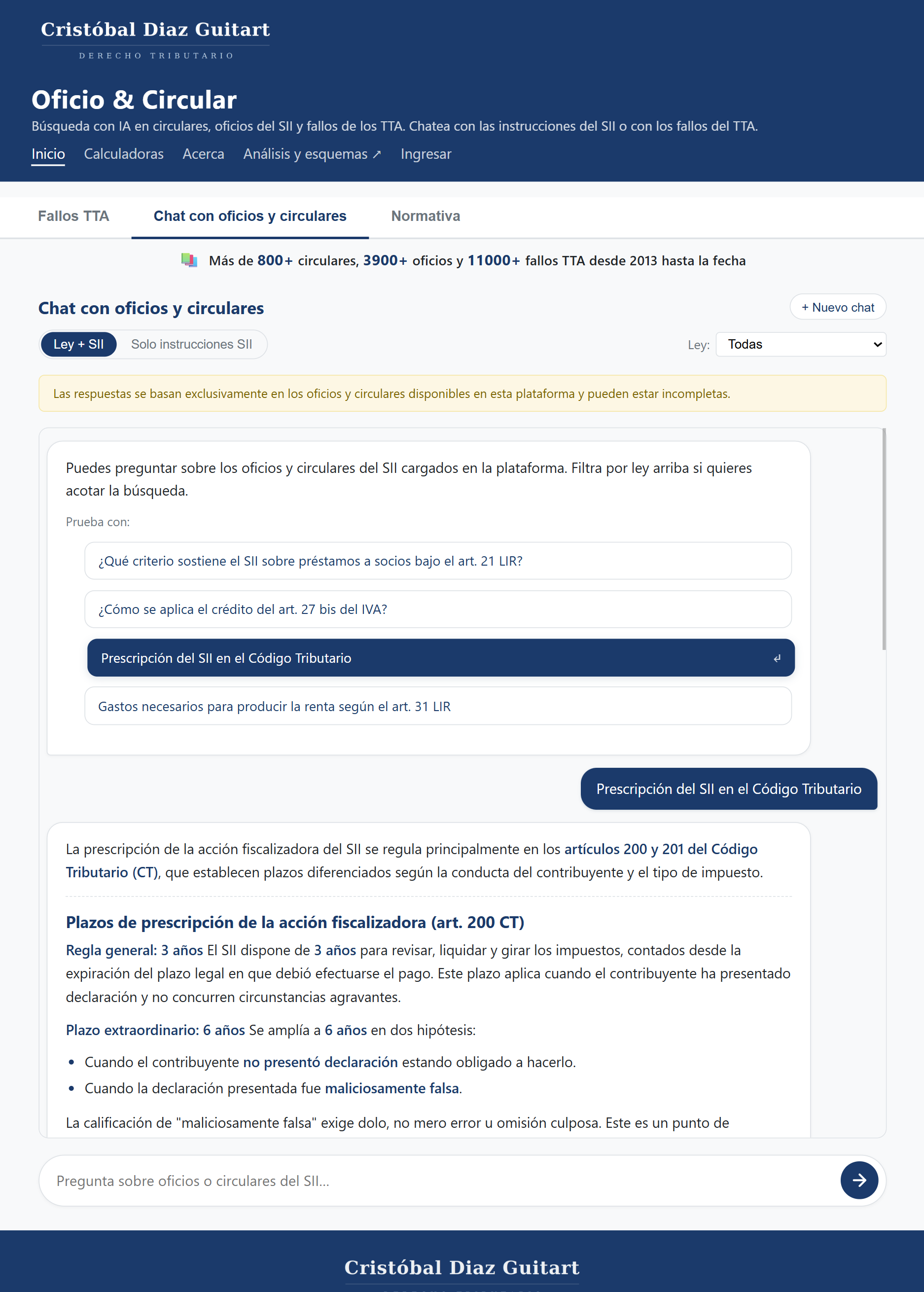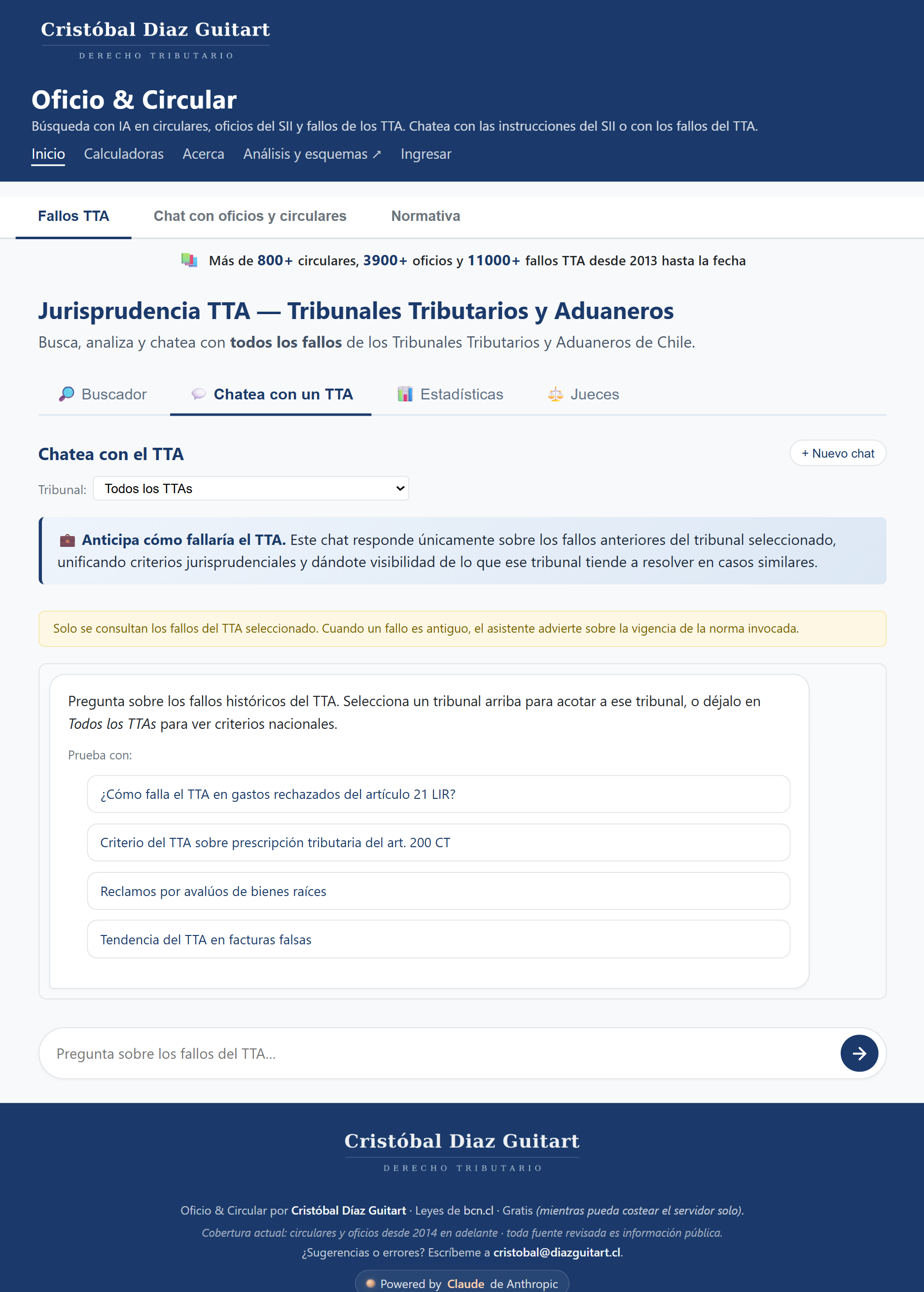 Construí un buscador con IA para profesionales tributarios. Chatea con 11.000 fallos del TTA y miles de oficios y circulares del SII. Gratis, sin login, fuente verificable en cada respuesta.
