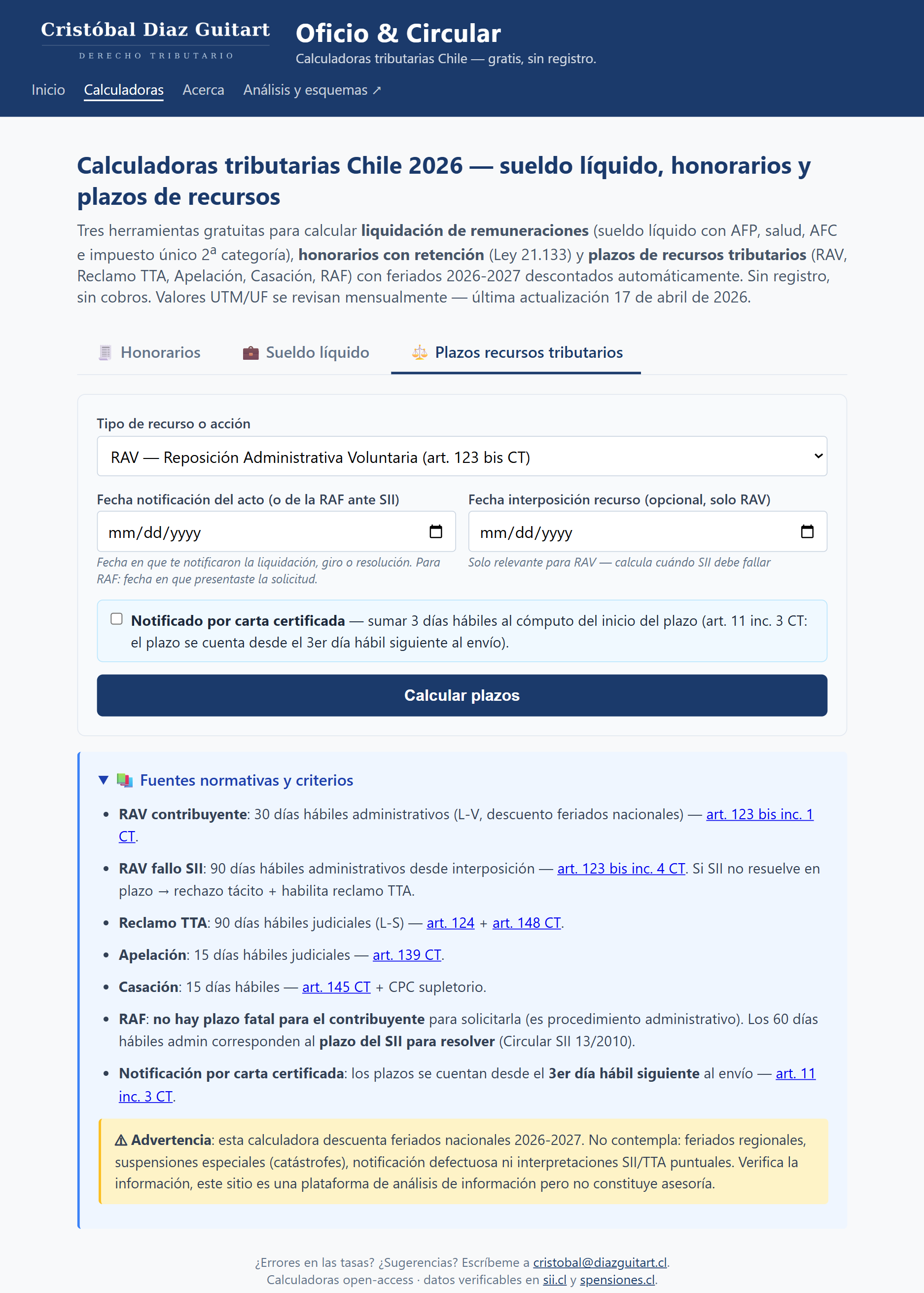 Usar calculadoras. Sueldo líquido, honorarios con retención Ley 21.133 y plazos de recursos tributarios -RAV, Reclamo TTA, Apelación, Casación, RAF- con feriados descontados.